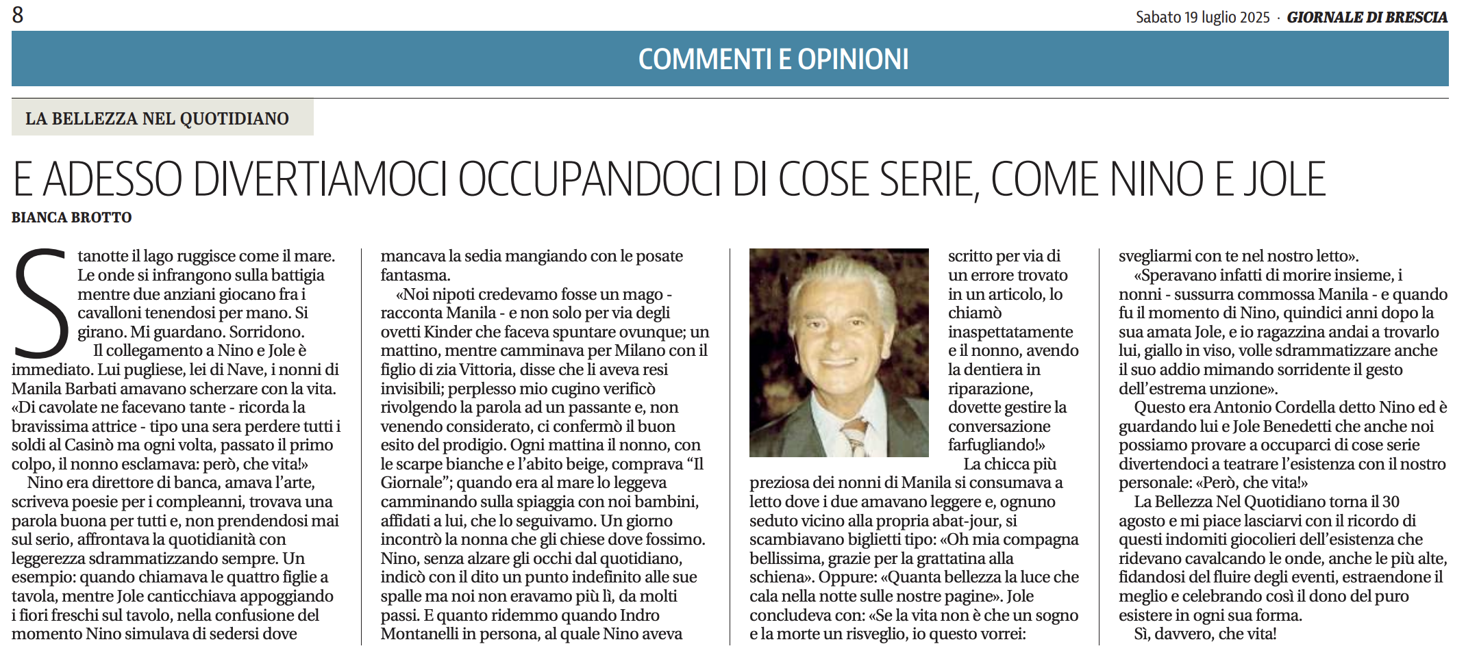 «Speravano infatti di morire insieme, i nonni - sussurra commossa Manila - Quando fu il momento di Nino, sette anni dopo la sua amata Jole, e io tredicenne andai a trovarlo, lui, giallo in viso, volle sdrammatizzare anche il suo addio mimando sorridente il gesto dell’estrema unzione».