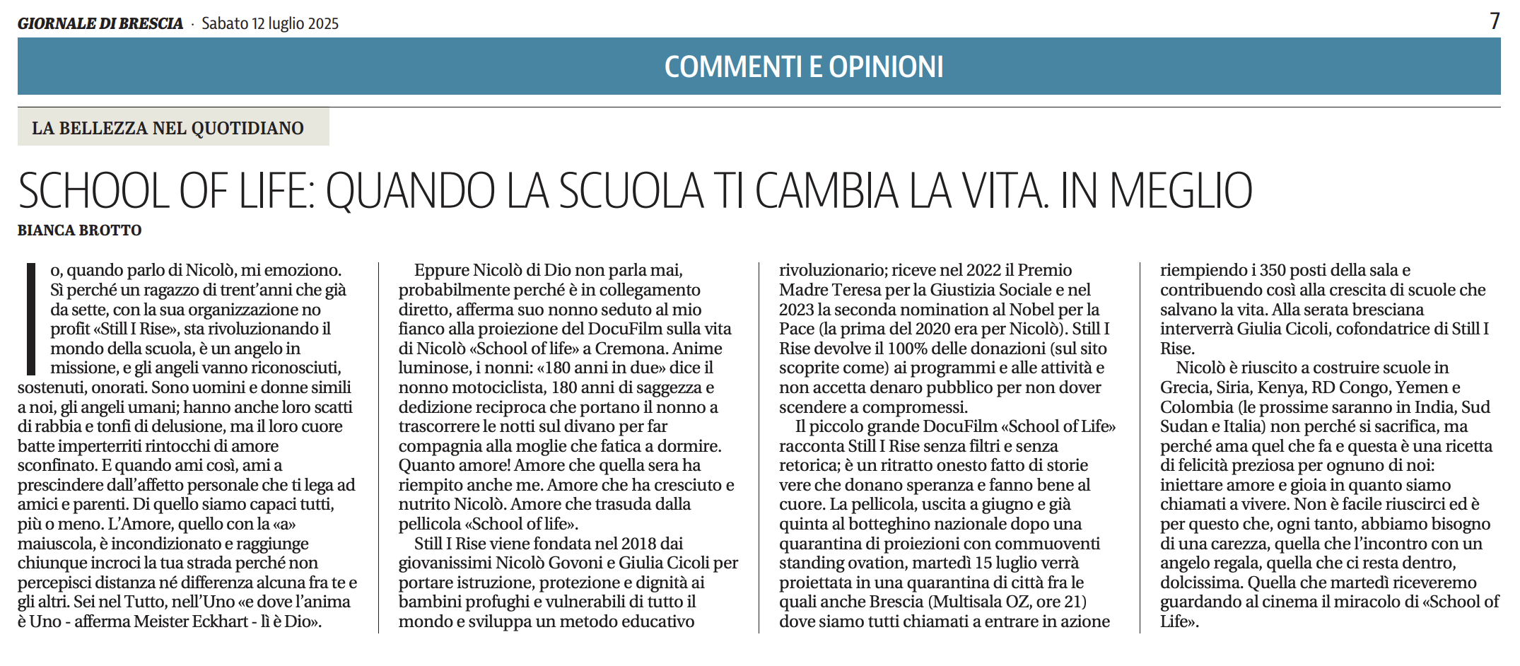 La pellicola, uscita a giugno e già quinta al botteghino nazionale dopo una quarantina di proiezioni con commuoventi Standing Ovation, martedì 15 luglio verrà proiettata in una quarantina di città fra le quali anche Brescia (Multisala OZ ore 21) dove siamo tutti chiamati a entrare in azione riempiendo i 332 posti della sala e contribuendo così alla crescita di scuole che salvano la vita. Alla serata bresciana interverrà Giulia Cicoli, cofondatrice di Still I Rise.