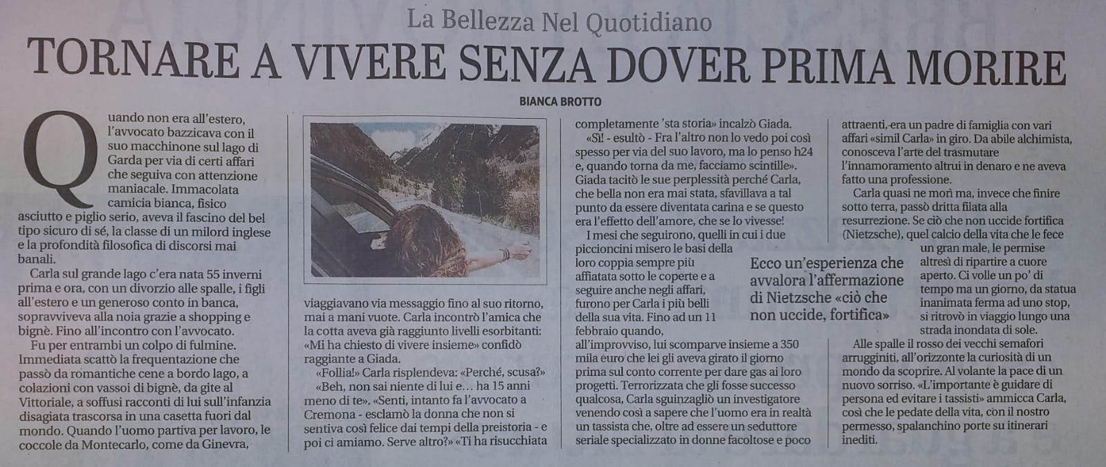 Carla quasi ne morì ma, invece che finire sotto terra, passò dritta filata alla resurrezione. Se ciò che non uccide fortifica (Nietzsche), quel calcio della vita che le fece un gran male, le permise altresì di ripartire a cuore aperto.