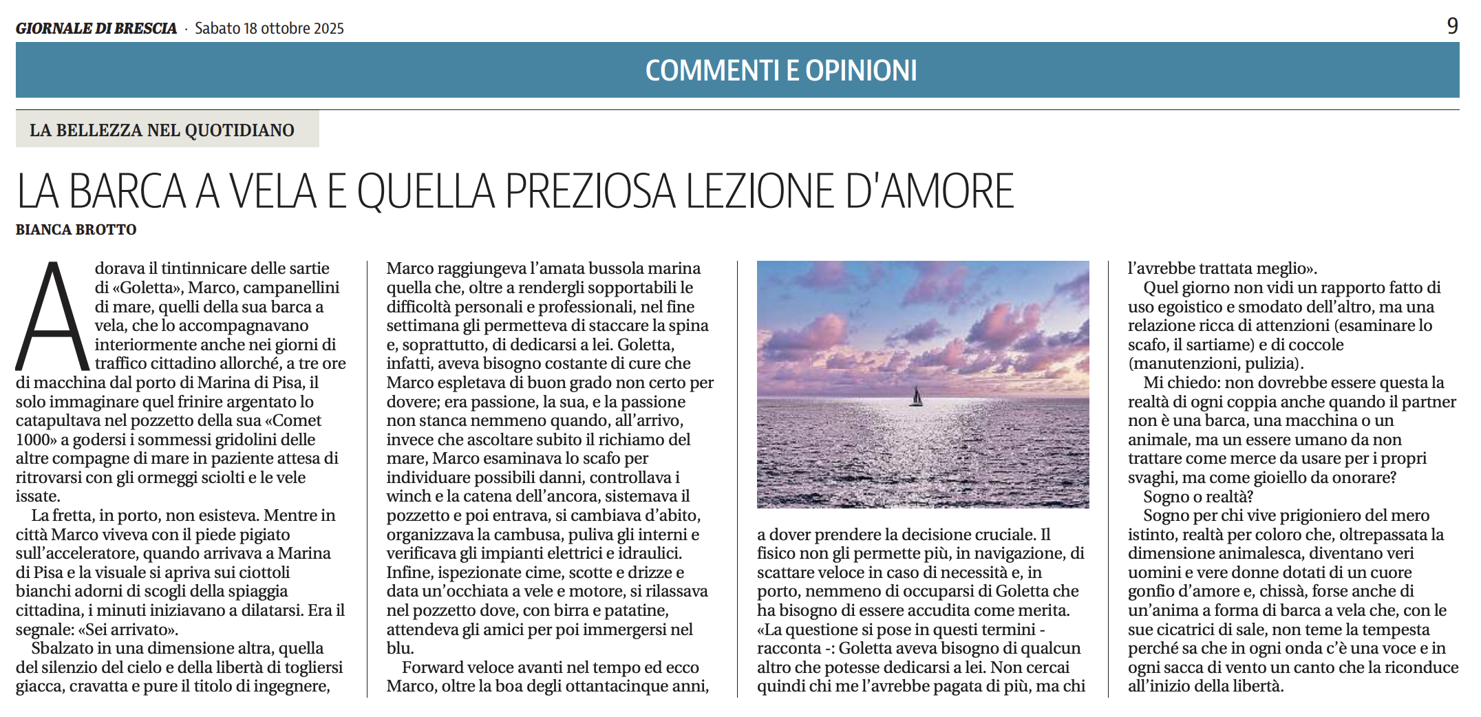 Quel giorno non vidi un rapporto fatto di uso egoistico e smodato dell’altro, ma una relazione ricca di attenzioni (esaminare lo scafo, il sartiame) e di coccole (manutenzioni, pulizia).