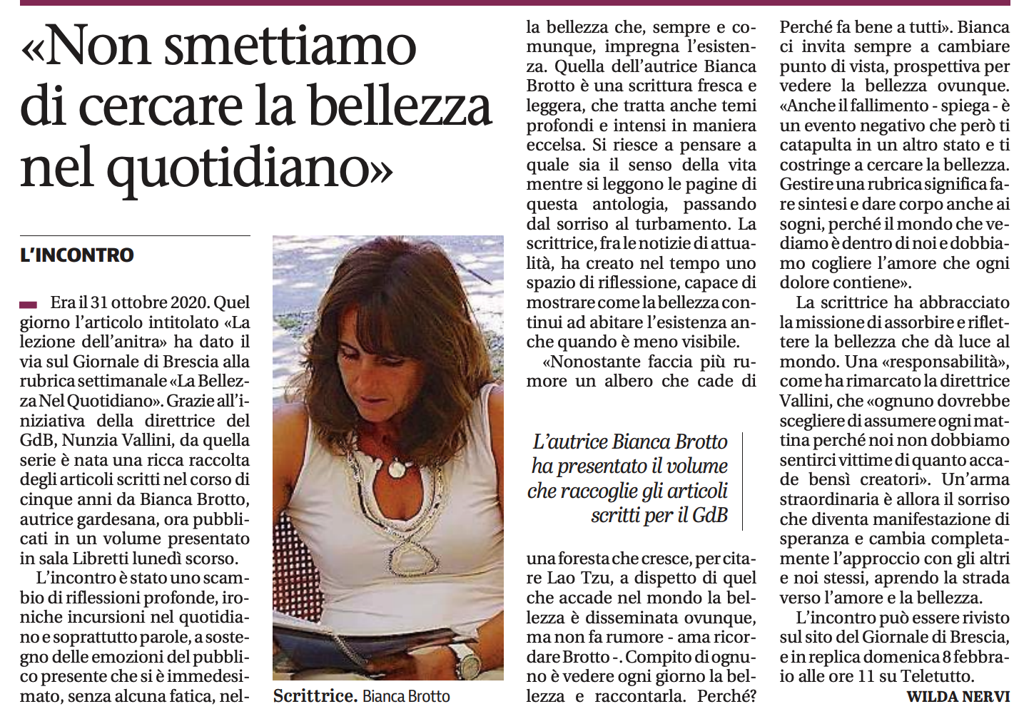 Era il 31 ottobre 2020. Quel giorno l’articolo intitolato «La lezione dell’anitra» ha dato il via sul Giornale di Brescia alla rubrica settimanale «La Bellezza Nel Quotidiano». Grazie all’iniziativa della direttrice del GdB, Nunzia Vallini, da quella serie è nata una ricca raccolta degli articoli scritti nel corso di cinque anni da Bianca Brotto, autrice gardesana, ora pubblicati in un volume presentato in sala Libretti lunedì scorso.