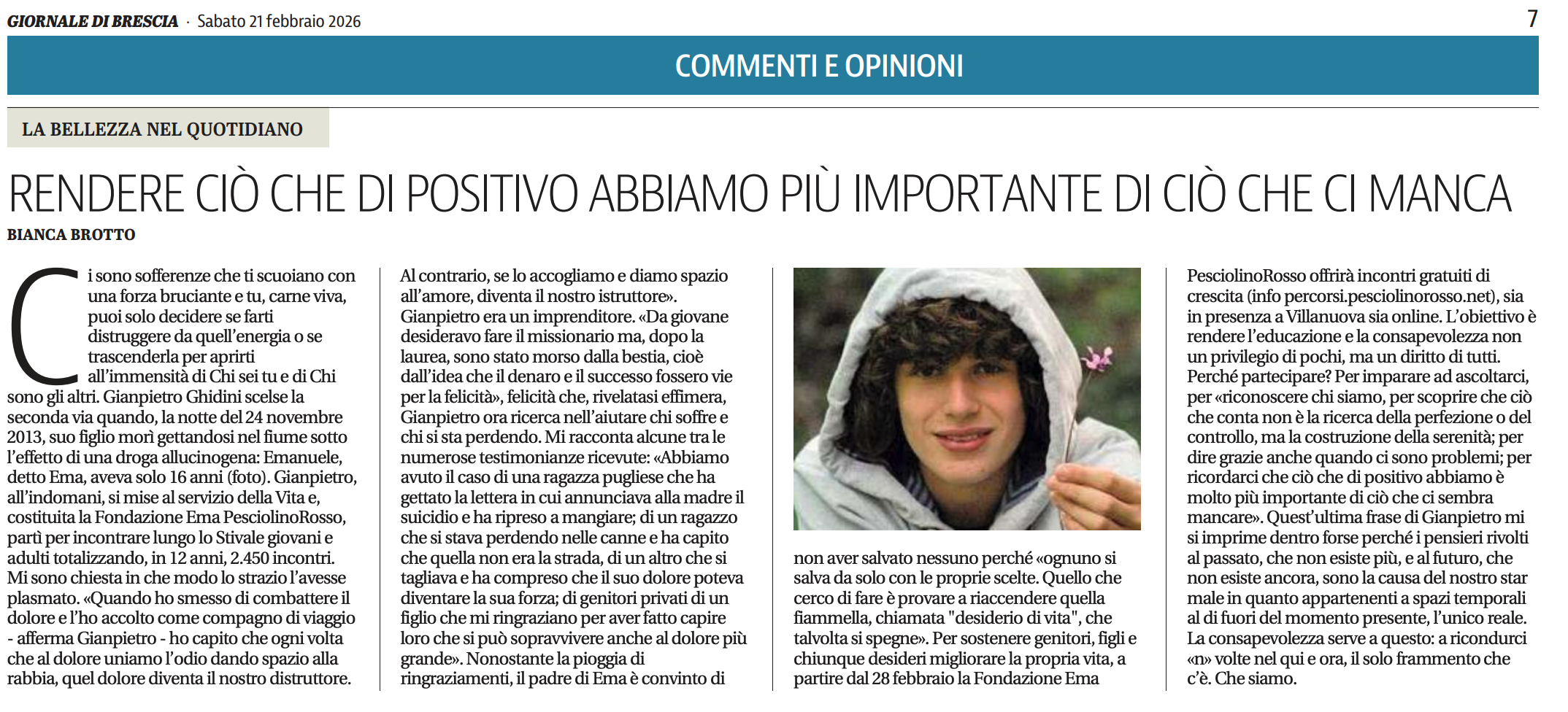 Per sostenere genitori, figli e chiunque desideri migliorare la propria vita, a partire dal 28 febbraio prossimo la Fondazione Ema PesciolinoRosso offrirà incontri gratuiti di crescita (info su percorsi.pesciolinorosso.net), sia in presenza a Villanuova sul Clisi (BS) sia online.