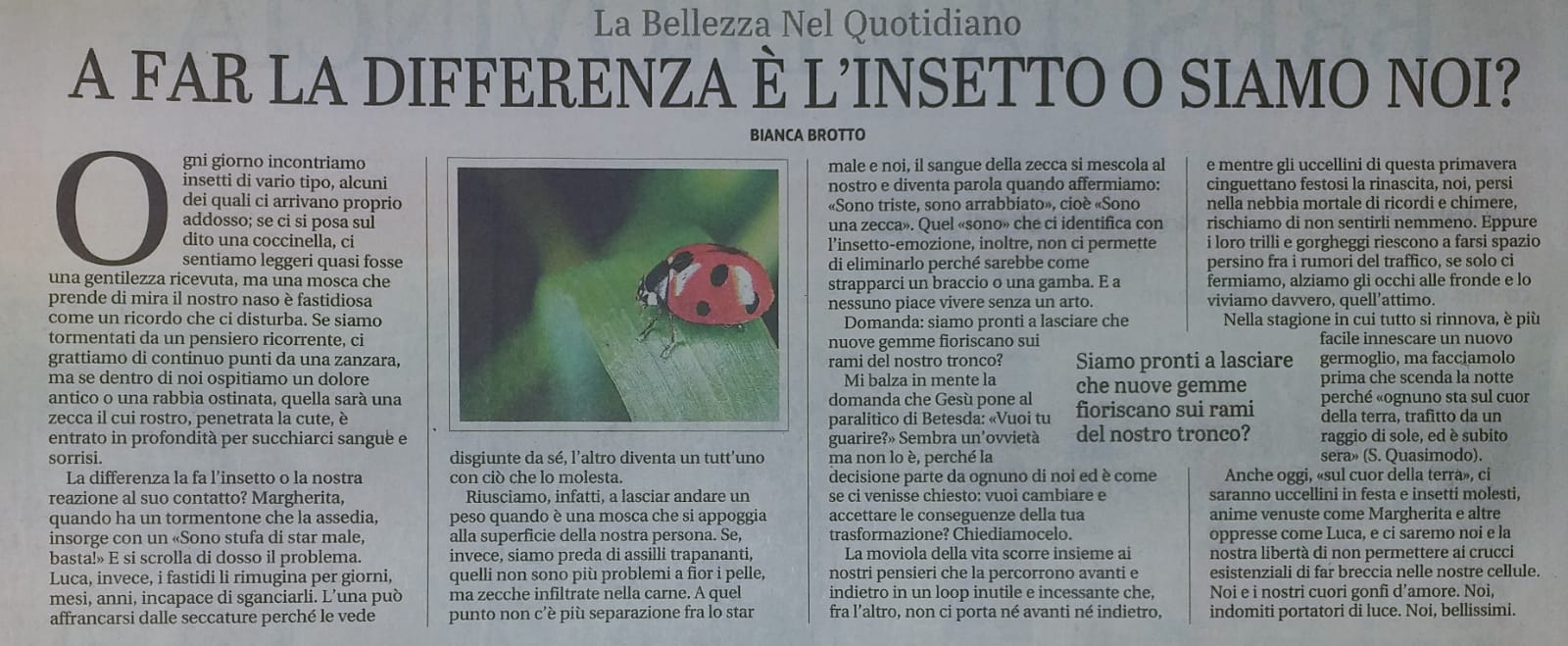 Ogni giorno incontriamo insetti di vario tipo, alcuni dei quali ci arrivano proprio addosso; se ci si posa sul dito una coccinella, ci sentiamo leggeri quasi fosse una gentilezza ricevuta, ma una mosca che prende di mira il nostro naso è fastidiosa come un ricordo che ci disturba.