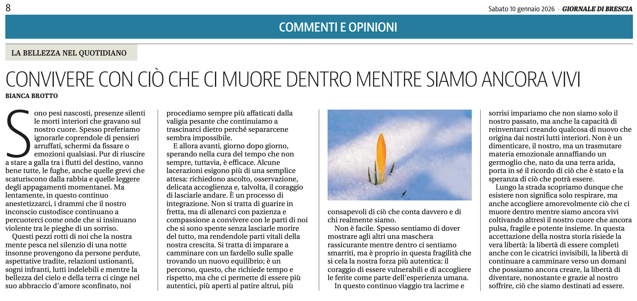 E allora avanti, giorno dopo giorno, sperando nella cura del tempo che non sempre, tuttavia, è efficace. Alcune lacerazioni esigono più di una semplice attesa: richiedono ascolto, osservazione, delicata accoglienza e, talvolta, il coraggio di lasciarle andare.