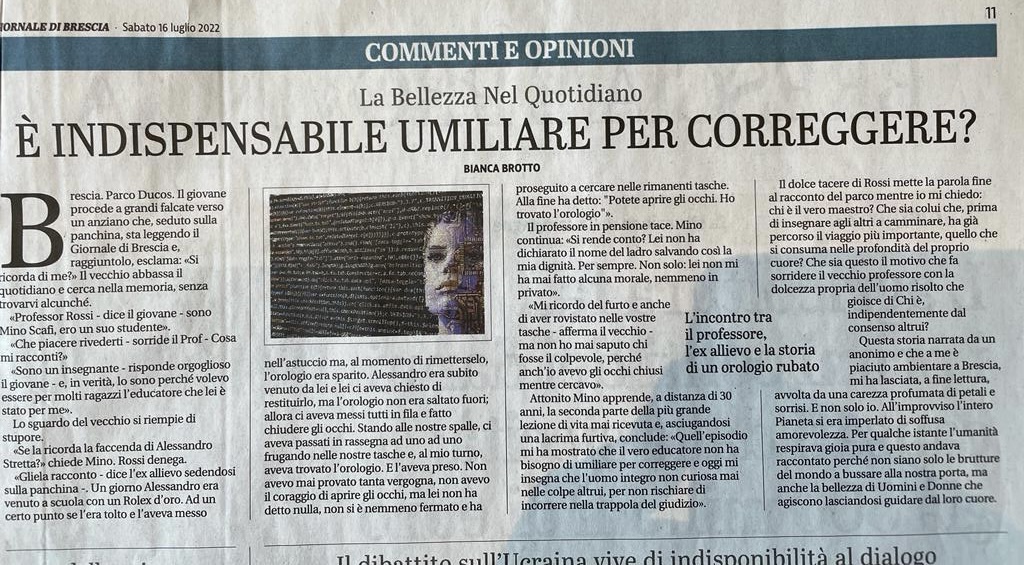 Attonito Mino apprende, a distanza di 30 anni, la seconda parte della più grande lezione di vita mai ricevuta e, asciugandosi una lacrima furtiva, conclude: «Quell’episodio mi ha mostrato che il vero educatore non ha bisogno di umiliare per correggere e oggi mi insegna che l’uomo integro non curiosa mai nelle colpe altrui, per non rischiare di incorrere nella trappola del giudizio».