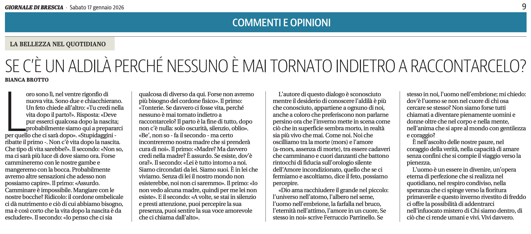 Il primo: «Tonterie. Se davvero ci fosse vita, perché nessuno è mai tornato indietro a raccontarcelo? Il parto è la fine di tutto, dopo non c'è nulla: solo oscurità, silenzio, oblio».